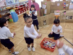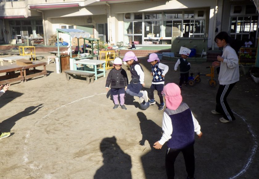 外に出るのはちょっと気が引ける寒さになってきましたが、クラスの前で年少さんが転がしドッジを始めると、一緒になって遊び始めるれんげさんです。そして