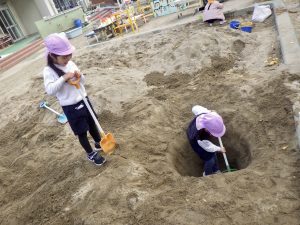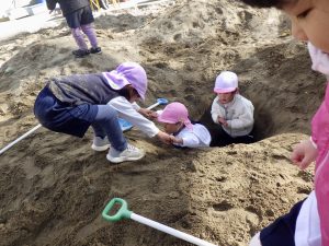 年少さんが一人で出られなくなるくらいの穴に成長しました!どの子も「穴があったら入りたい」という気持ちになるようで、ぴょんと飛び込んでは出られなくなって笑っています。そこに年中のお姉さんがやってきて手を差し伸べて出られると、また入って出してもらってを楽しんでいます。この穴どうなっていくのでしょうか?