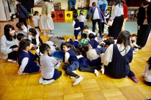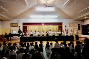 はじめは、保護者の有志の方が今日の為に何回も集まって練習してくださった、ハンドベルの演奏を聞かせていただきました。どの曲を奏でるのかは、ケルシー先生が英語で歌ってくださいました。
