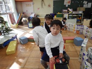 空き箱で乗り物を作って引っ張って走らせることがが大好きな子供たちですが、園庭でのカーレースごっこ、電車ごっこ、室内の乗り物ごっこなど遊びが広がってつながってきていることに成長を感じます。