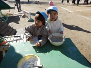 石けんを削って作る泡作りも根気良くやっています。きめの細かいトロンとした泡が作りたいようです。でも、なかなか難しいのです。そこで考えたやり方は、「2人で交代でやってるの!」「混ぜる人と削る人なんだよ。」とのことです。砂を少し入れてココア味ができました。できないと諦めるのではなく、実現できるやり方を2人で相談してやっているところが素敵です。