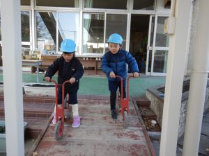 少し前に、土山から足こぎ車でカーレースごっこをしていましたが、バランスをとるのが難しいスクーターにも挑戦しています。