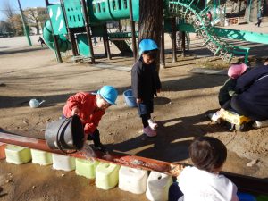 寒い日もありますが、子どもたちは、元気です。「流しそうめん、しようよ。」と提案する子がいました。「いいね。」と賛成して、遊びが始まりました。子どもたちが、樋や椅子をたくさん運んで、長くつなげていきます。やりたくなったら、寒さも気にならないところが、いいですね。夏にやって、楽しかったよねー!!