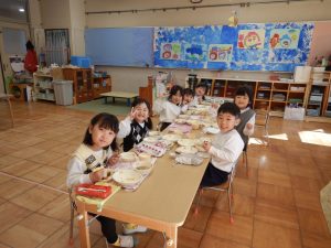 給食交流も行いました。「お兄ちゃんやお姉ちゃんと給食食べるの?」、「私は、さくら組に行くの?」など朝から楽しみにしていました。クラスが違っても互いにお名前を呼び合ったり、好きな食べ物について話したりして楽しい時間となりました。