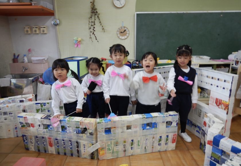 室内では、胸に折り紙のリボンをつけて、牛乳パックの囲いを丸くして、ステージごっこです。「ここに並んで!」と自分たちで