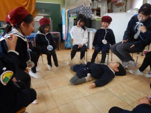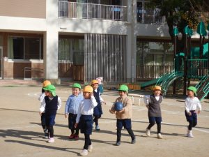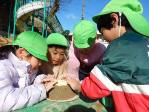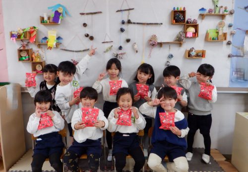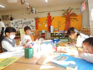 また、一学期の共通体験と、夏休み期間を含めた家族での体験が合わさり、色々なごっこ遊びが生まれました。「ピーピー(鳥)ごっこ」が進化した「ピーピー学校」では、就学時健診や加納小学校との交流の後に、最高に楽しい小学校ごっこがくり広げられてきました。子どもたちにとっての学校のイメージは、兄姉から見聞きする国語、算数、体育、音楽、それに「国旗」や、毎月経験する「身体測定」も授業(遊び)の1つでした。自分たちで、「小学校はこんな感じ?」と、考えを膨らませて、ポジティブに捉えている姿に脱帽でした。最近では、「サンタミッション」をきっかけに謎解き旋風が起きました。一学期の宝探しごっこも、謎解きの要素が加わり、自分も含め一緒に遊ぶ友達にも楽しんでもらいたい気持ちで遊んでいます。