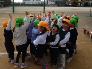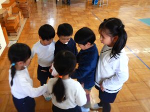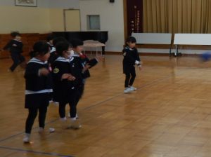 その姿に繋がったのは、何といっても親子ふれあいフェスティバル②を通して、自分事として、どうしたいか考え、クラス、学年で色々な遊びを積み重ね、話し合い試しながら創ってきたからに他なりません。その時のさくら会議での対話の場面がすごく印象的でした。「私は、(リレーに)勝っても負けてもどっちでもいい。」「私も。」「勝ったら、(相手チームが)悲しいし。負けたら、嫌だし…」「Aちゃんは、どっちのチームのことも考えてるんだね。」「でも、私はそんな風に言ってほしくない。」「一緒のチームの友達がそんな風に言ってたら、勝っても嬉しくない。」…皆で決めるということは、その人数分の感じ方や考え方があります。遊んだり、話し合ったりする中で、少しずつその感じ方(言葉の意味)を知って、皆が「これなら」というものに向かっていく過程の中にたくさんの学びが詰まっていると思います。最近のドッジボールでも、「勝ち負けはどっちでもいい。」という言葉が聞こえてきますが、「悔しい!」と表情が物語っており、再度、試合が行われています。同じ言葉でも心もちが変化しています。さらに、一緒に遊ぶ友達の「遠くまで投げたい」「ボールをキャッチしたい」等の思いを感じて、自分なりにアドバスしたり、一緒に練習したりする姿がとっても温かいです。