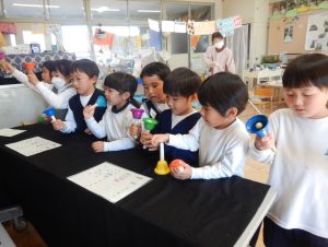 クリスマス楽しみ会のベルの演奏に感動し、自分たちもと、早速ベルを使って遊んでいます。