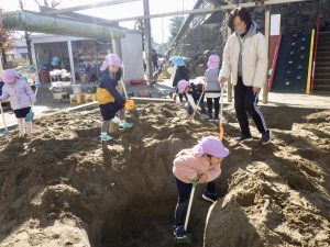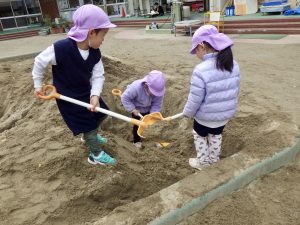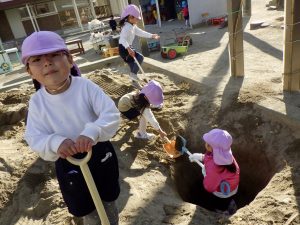 年少さんが出られなくなってからも掘り進めると、砂を出すのも一苦労になりました。しかし、ある子が「そうだ!いいこと考えた!」と友達に「ここで待ってて、砂を取って!」とお願いしました。中の子がスコップで外の子に渡し、外に出した砂をさらに奥まで掻き出す連携プレーです。目的のために工夫をしている姿が嬉しく思いました。そして