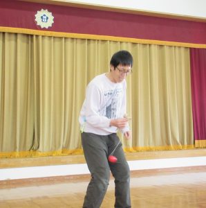 コマを回すだけでなく、コマを手のひらにのせたり、小さいおぼんにのせたりと、先生たちは頑張りました。