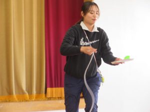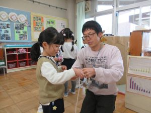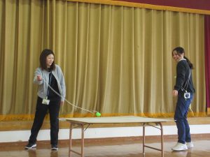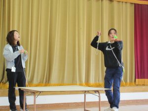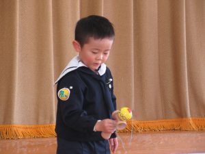 最初は、なかなかうまくいかなかったのですが、最後まで諦めず、みんなからの声援をパワーにして、「けん」に玉をさすことができました。