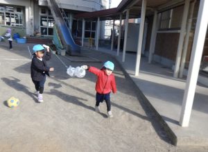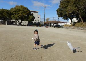 1月は、冷たい風が吹くので、凧揚げ日和です。始業式で、私が馬を描いた凧をあげたので、より興味が出たようです。レジ袋の口を広げて、息を吹きかけ膨らましてから揚げたこともよく見ていて、「先生、ふーっして!」と、凧が揚がるように頼む姿があり、そこがまた、かわいいです。