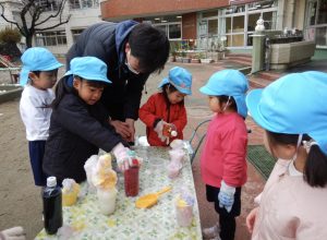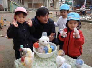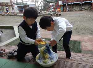 朝の寒い日が続いていますが、みんな元気に登園できています。雪を集めてかき氷作りを楽しんでいました。赤・青・黄色の3色のシロップを用意すると、「いちご味にするね。」、「黄色もかけると、オレンジ色になった!」など、思い思いの味付けをしていました。白い氷に色が付くことがうれしくて、また2色が混ざって新しい色になることを発見し、目を輝かせていました。