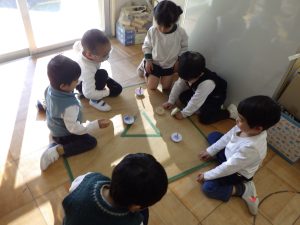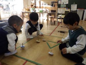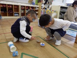 コマ回しでは、駒に自分で描いた模様の画用紙を入れることで、それぞれの周り方や色、模様の違いを楽しんでいました。「綺麗な色だね!」「すごく早く回ってるよ!」「誰が一番回っているか競争しようよ!と、友達と一緒に楽しんでいました。