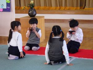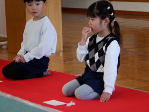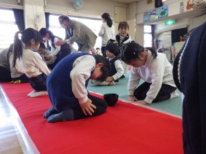 子どもたちのお辞儀は、少し力の入った、ぎこちなさが見られ、年中児らしく可愛らしかったです。
