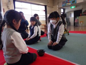 その後、年長児がそれぞれ立ててくれたお茶が運ばれ、子ども同士でお辞儀をして、いよいよ、お茶をいただきます。