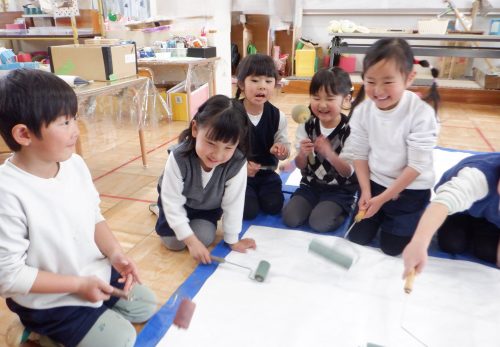 1月になり実際に雪が降ると、大喜びの子どもたち。1日目から雪を振りまきながら、2日目は「ティアラ作る!」と雪の女王が次々に誕生し、園庭がアレンデール(雪の国)に変わりました。王子様もトナカイも出てきました。