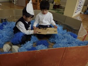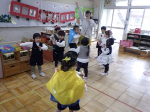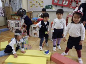 ウレタンブロックで鬼を作って、豆を使って追い出しました。子ども達の力強い豆に鬼も逃げていくことでしょう(笑)