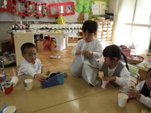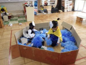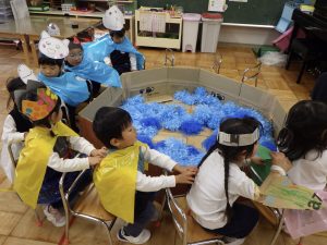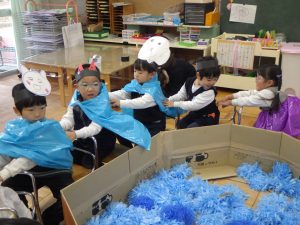 また、新聞紙をちぎって丸めてテープで貼り、豆を作りました。以前までは自分で新聞紙を切り、丸めることが難しかった子ども達ですが、今回の豆作りでは慣れた手つきで新聞紙をちぎり、自分で丸めて浮いている所を見つけてテープで貼るという作業を自分で行っていました。日々の製作遊びが繋がっていますね。