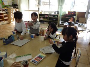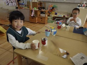 また、部屋では豆まきごっこも楽しみました。自分の鬼のカップを作り、みんなで顔を描きました。「もっと描きたい!」と2、3個鬼の顔を描いて紙コップに貼っている子もいましたよ。一人一人の鬼の顔はとても可愛らしかったです。
