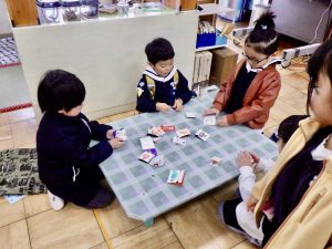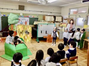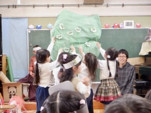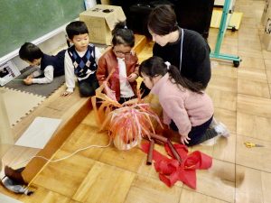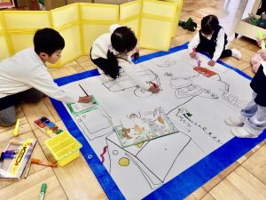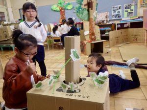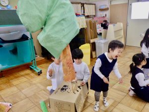 お互いのクラスで刺激を受け合い、表現する楽しさ、見てもらう嬉しさを感じながら劇遊びを繰り返し楽しんでいます。「次は、ちゅうりっぷ組とさくら組といちょう組だね!」とまだ見せていないクラスに来てもらうことを楽しみにしながら、追加の道具作りをしています。