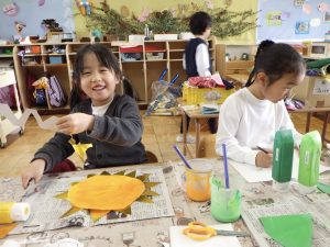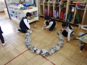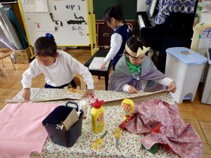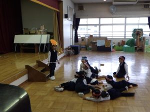 何でこのお話をやりたいのか、どんなところが楽しくてこれをやりたいと思ったのか、説得タイムです。なんと気が付いたら1時間話し合っていましたが、決まりませんでした。「じゃあ違うお話でやってみて、これがいいって思うかも!」1つ新たな絵本で劇をやってみましたが、「こっちがいい。」「私はこっち。」う〜ん。「次はこのお話やってみようよ!」と話すぐらい、みんなで表現することが本当に楽しいようです。