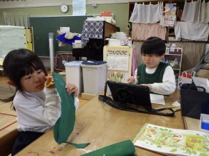 そこからは、早いのです!次から次へとアイデアが出てきて、「こうしたらどう?」「〜ってことにしない?」1つの絵本を基に、登場人物やストーリーはいちょう組オリジナルです。