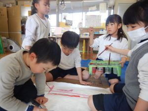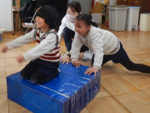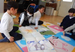 まだまだお話を膨らませている最中ですが、絵本に出てくる登場人物を、自分たちが出会ってきた(印象に残っている)生き物に変えたり、生き物に合わせた勝負や展開を考えたりもしています。実際に皆でやってみると、「アイス食べるなら、(アイス)缶に皆んなで入っちゃう?(笑)」「助けるために勝負して勝ったら教えてもらおうよ。」「泳ぎ勝負とか面白そうだよね。」「次は、ジャンプ(勝負)にしてみる?」等々、どんどん閃きますね。自分が登場していない時も、見たり、考えたり、応援したりして皆でお話を創る楽しさを味わっています。