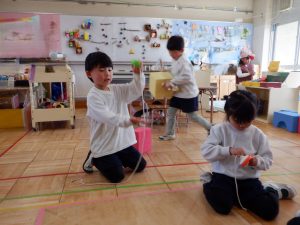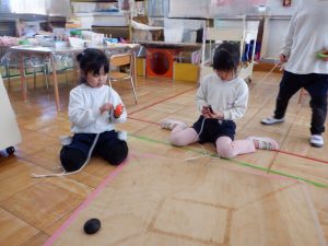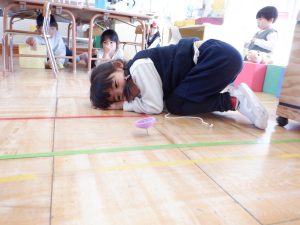「回った!できた!」という子が数人増えてきて、中には悔しくて、泣いたり、すねたり・・・といった姿も見られますが、なんだかんだ気づいたら再チャレンジしている様子が見られます。