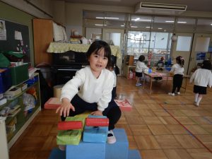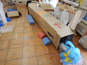 ガムテープでつなげた段ボールを出した時、段ボールが安定せず、少しゆらゆらしていました。すると、「積み木で受け止めよう!」と考えた子がいました。段ボールの横に積み木を運んで来て置くと、少し安定しました。『倒れるから、先生、やって。』ではなく、自分たちで考えたり、工夫したりできるのです。