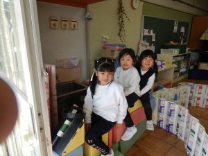牛乳パックで作った手作りの囲いや積み木で場を作っていきます。2人ぐらいで遊び始めますが、「入れて。」と仲間に入っていく子がいて、「ここに3人で座ろう。」などと声を掛け合っていました。友達と3人乗りができてとても喜んでいました。