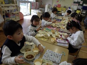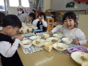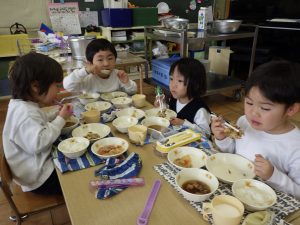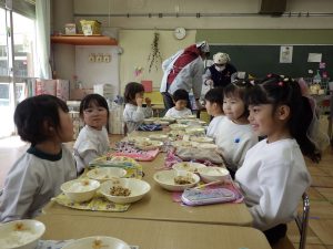 年少組の2クラスで給食交流も行いました。半数ほどの子が違うクラスに行って給食を食べました。クラスが違っていても友達の名前を覚えています。きょうだいの話や大きくなったらなりたい仕事などを話したり、聞いたりして、楽しいひとときとなりました。担任でなくても、おかわりを頼んだり、苦手な食材を減らしてもらったりすることもできていました。「歯磨きをしたら、また来るから!」と入り混じって遊ぶことができました。
