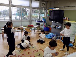 保育室の中でも、「せーの!」掛け声でみんなで回すこま回し大会。