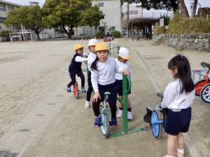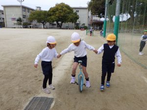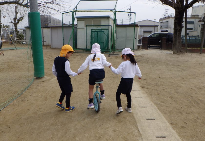 一輪車では、少しずつ自分でバランスを取りながら乗れるようになってきました。