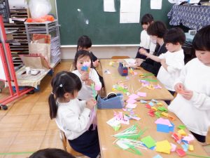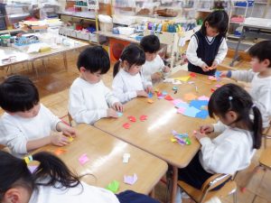 いくつかある中の一つに、「折り紙でお花を作って渡したら?」「背中に隠しておかなきゃ!」というアイディアがあり、数人でチュウリップを折り始めると、「私もやる!僕もやる!」と人数が増えていきました。