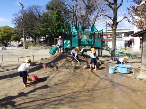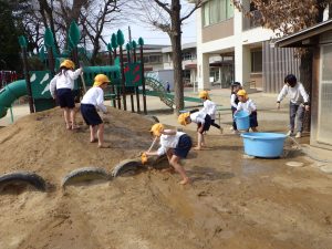 「まだまだ全然時間が足りない。」「ごはん食べた後もやろうよ!」「そうしよ!」「でも(着替える)服が無い。どうしよう〜。」「着替えて給食食べて、また汚れている服きてどろんこしたらいいんじゃない?」「あ〜なるほど〜。いいかも!」自分たちで話して、解決策を考えて、喜び合っています。