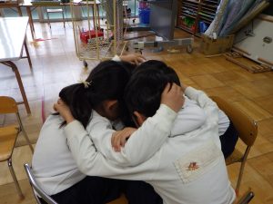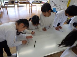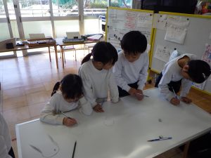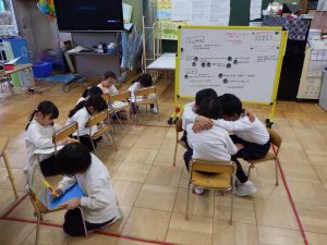 丸くなって話し合って、決まらないとなれば一度バラバラになり紙に書いて表したり、頭を寄せ合って考えを出し合ったり・・・。