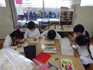 「この絵めっちゃいいよね!」「いい感じ!」と口々に聞かれます。(下書きの時から話していましたが)きっと一から自分たちで話し合って考えて決めてきたので、それが形になると嬉しいですし、自信にもなりますよね!
