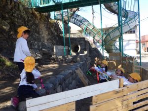 「温泉作ろう!」「ここから水が漏れる〜!」「壁を作らなきゃ。」「僕は水を運ぶよ!」「よろしく!お願いね〜。」こんな感じで役割分担しながら、自然に同じ目的に向かっていきます。