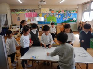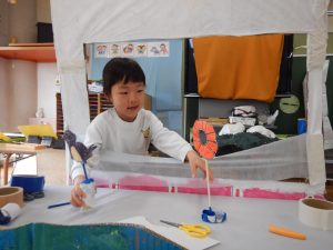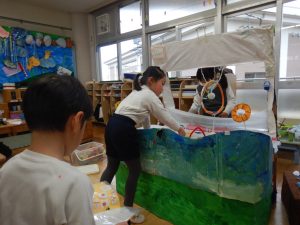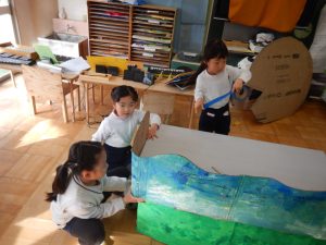 そこで、子どもたちは、劇と遊びの2つ(劇をパネルに遊びを模造紙に)作ることを決めました。やるぞ!と決まってからの瞬発力は知っての通り。