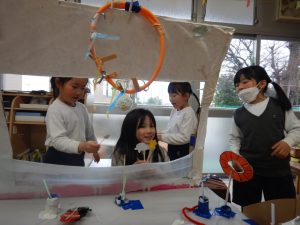アザラシが住んでいる場所、好きな食べ物、大好きな遊び(芸)を想像しながら、人形劇のイメージで、友達と協力して形にしていきました。