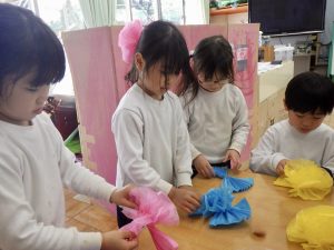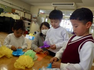 破れないようにめくること、広げることは集中力や力加減が必要ですが、綺麗なお花を作りたい思いから、黙々とお花作りを楽しんでいました。