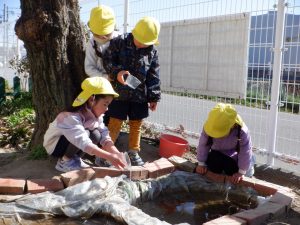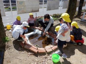 走り疲れた時には、水休憩(給水)をして、みんなで作った『しみずがわのおいけ』の様子を見にいきます。