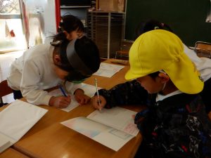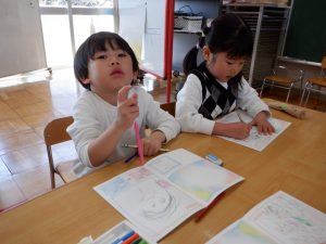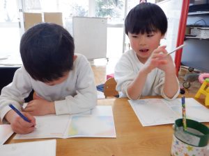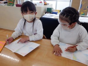 何やら「見ないでよ〜。」と言いながらこっそり何かを描き始める子どもたち。