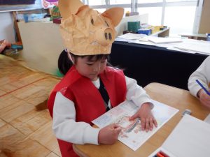この1年、友達や先生と遊んで楽しかったことなどを話しながら進級カードに絵を描いたり、手形を押したりしました。