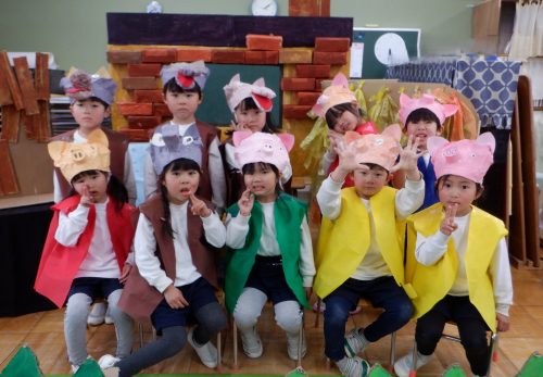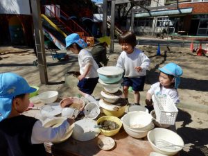 生き物、キャラクターなどお面や小物をつけるとすぐになりきれる子どもたち、服の汚れも気にせず、全身で泥んこ遊びが楽しめる子たち。いろんな素材にも触れて遊びました。そして、帰りの会の絵本を毎日楽しみにしていました。