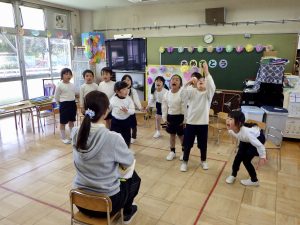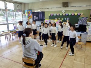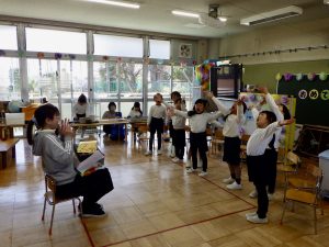 完全に自分たちが楽しんでいましたが、なりきって楽しそうすぎるいちょう組の子どもたちを見て、園長先生も嬉しくて楽しい気持ちになってくださったようです。やっぱり自分たちが楽しむって大切ですね。フラッグ隊の子たちも一緒に一生懸命歌ってくれていました。