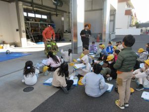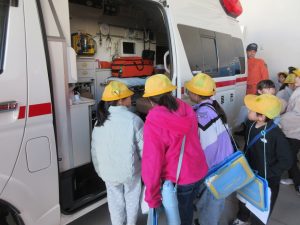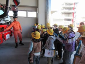 3年生は、南消防署に行きました。消防署では、消火時に着る服を実際に着させてもらったり、消防車を近くで見たりしました。また、みんなの街を守るために、24時間働いてくださっているお話を聞くこともできました。消防士さんの消火服への早着替えはとても素早くすごかったですね。