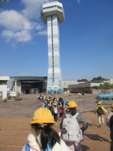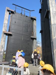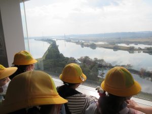 4年生は木曽三川公園と船頭平閘門に行きました。船頭平閘門では、船が水面の高さの違う川を進むときの、水門で水を調節し、水面の高さを一定に保つ仕組みを見せていただきました。また、展望タワーから見えた大きな河川が合流する様子に驚き、川と共に暮らしていた昔の人たちの暮らしを考えることができました。
