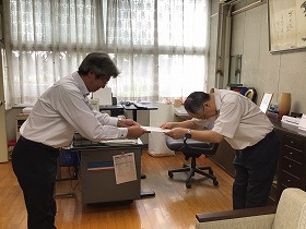 これは、今年度、「公益財団法人田口福寿会」様より、学校教育図書としまして図書館に473冊の本を寄贈していただけることになり、その贈呈書をお持ちいただけたということです。